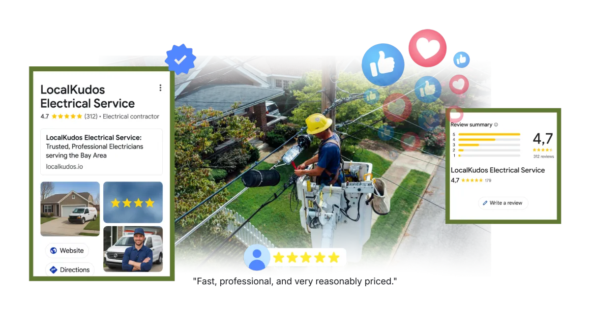 Whether it’s an EV charger install, a panel upgrade, or an emergency call, happy customers rarely leave reviews on their own. LocalKudos sends a friendly branded request right after the job is done. Homeowners get a simple text or email that guides them straight to your Google Review page. No awkward asks. No chasing.
